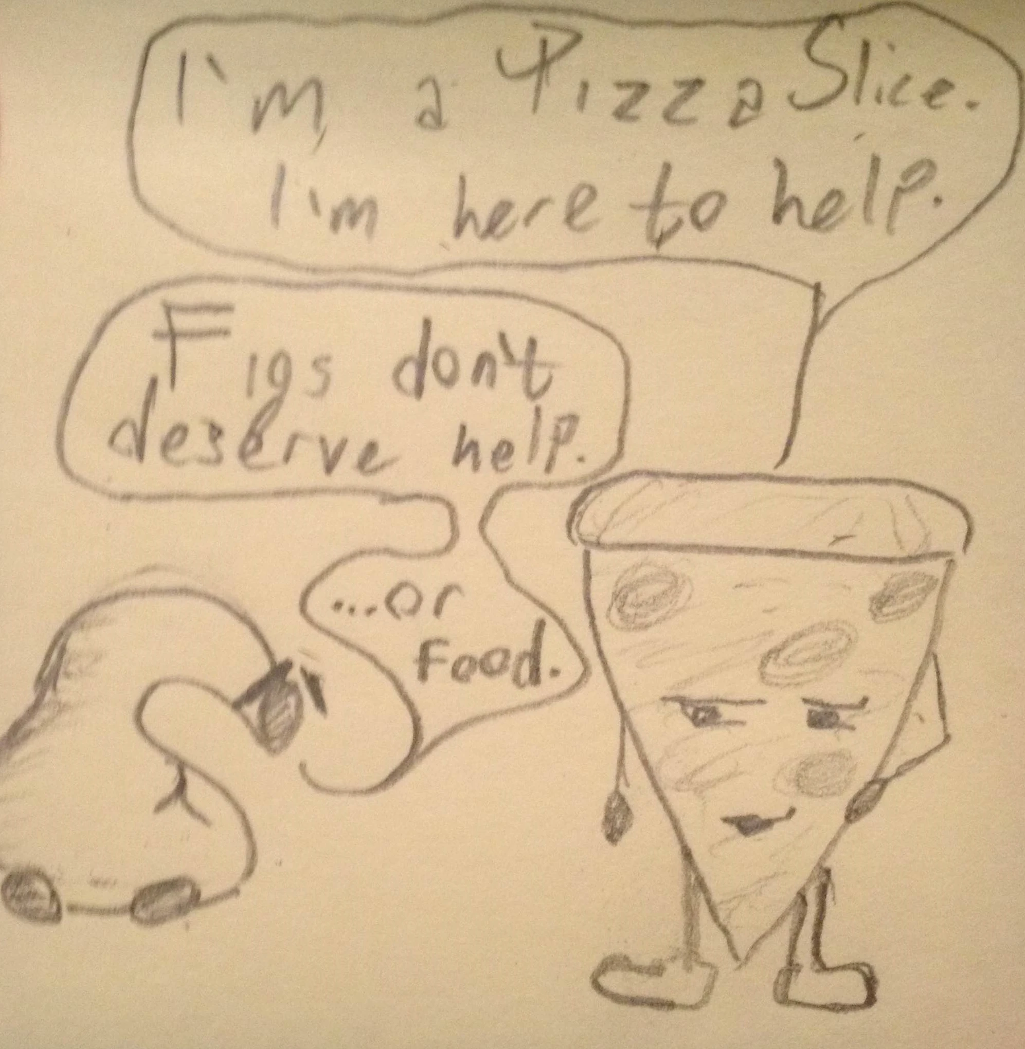 A customer had walked into the pizza parlor where the Pizza was born, and requested half a slice of Pizza. It was right then that the Pizza realized what was going on.